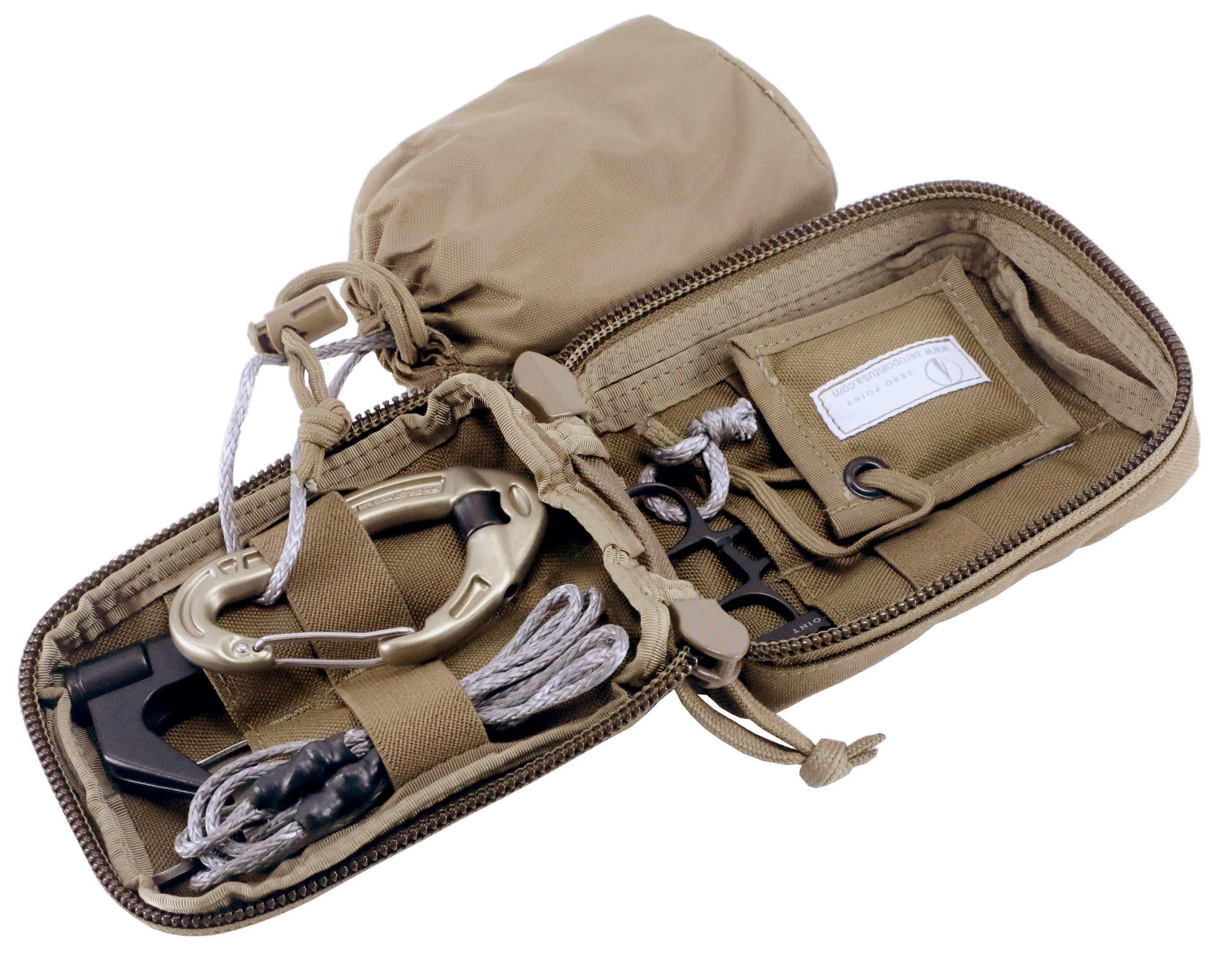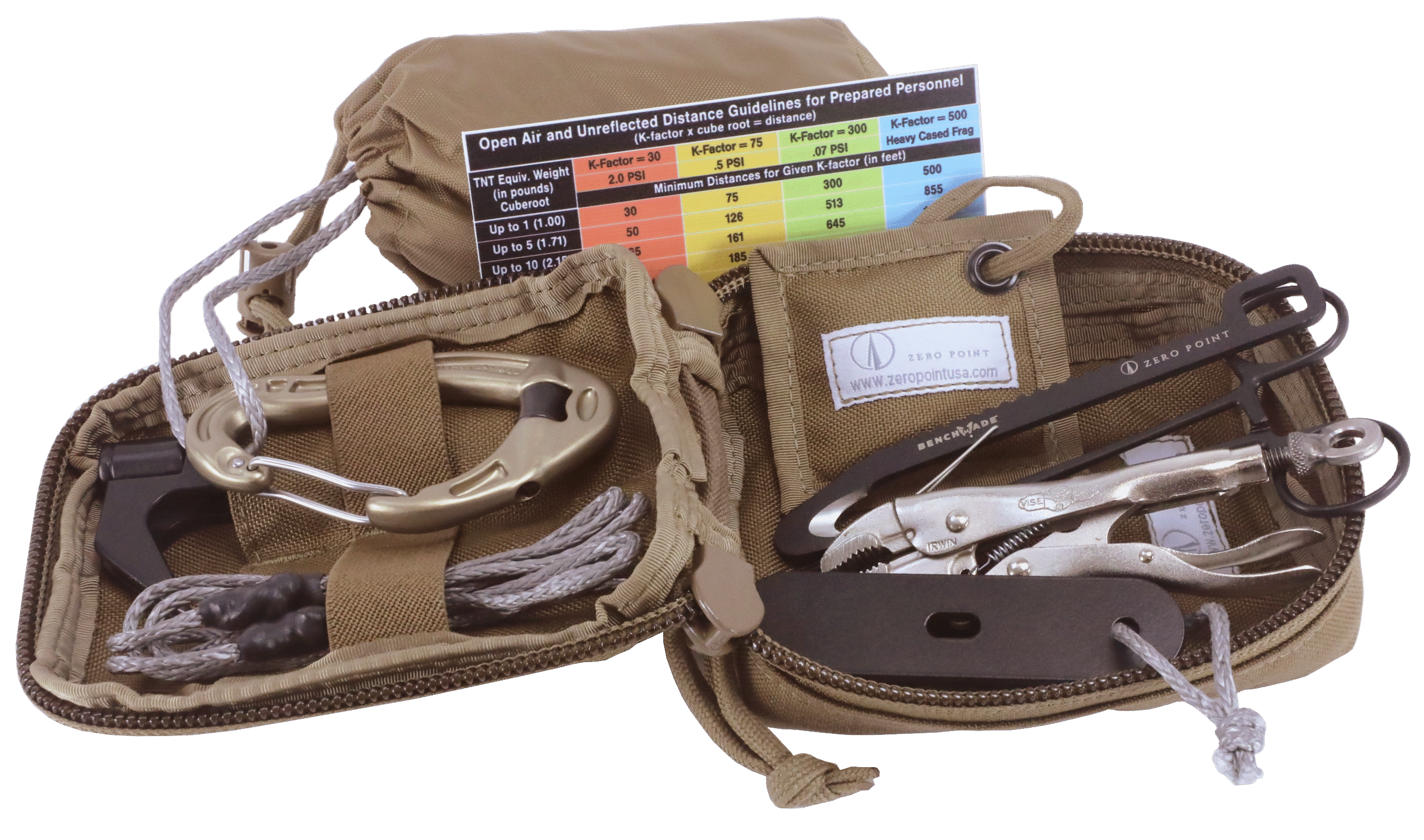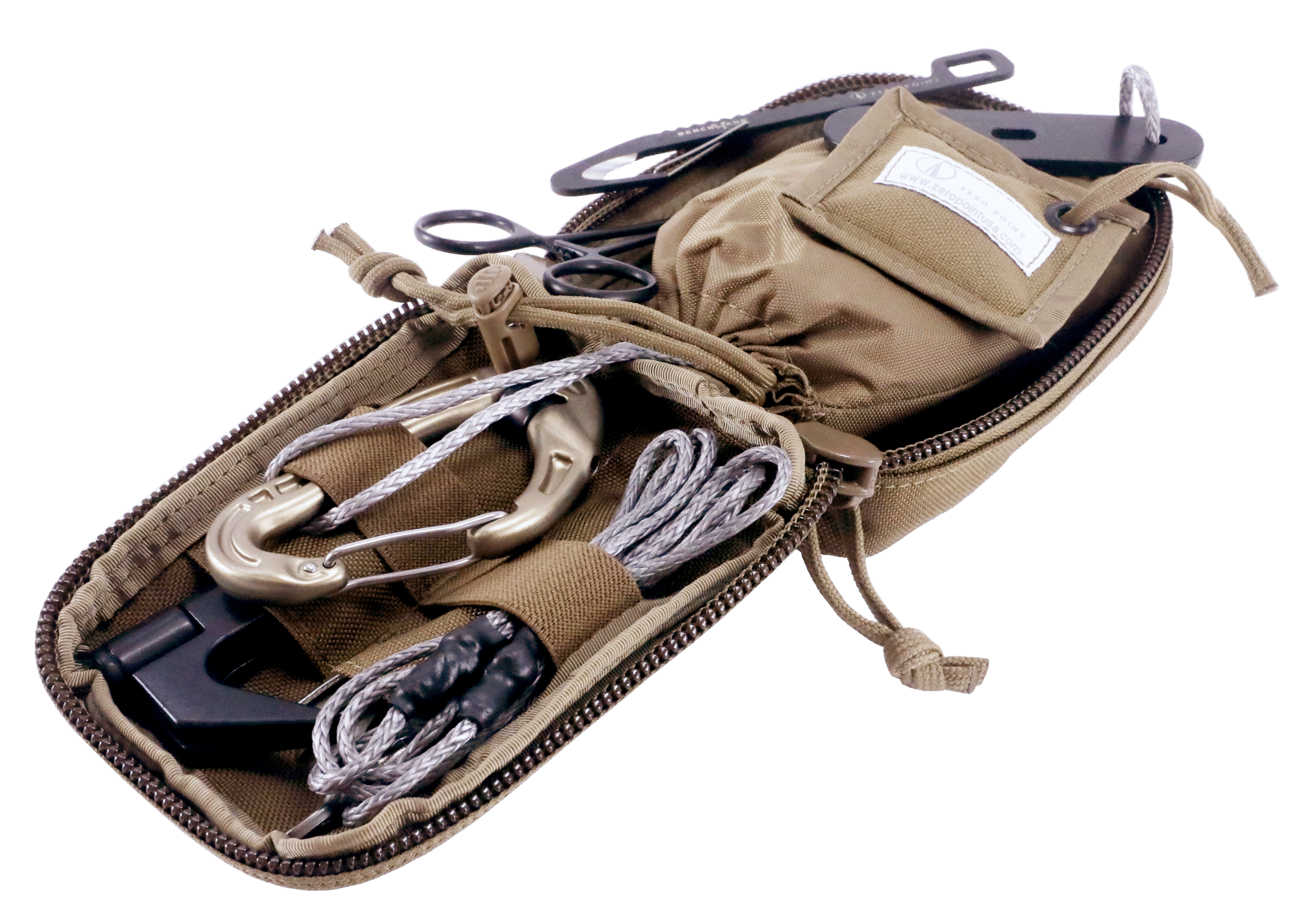The included tools are designed for quick attachment of the Dyneema pull-line, decreasing time-on-target, and limiting exposure to possible explosive hazards. All tools are easily accessible in the book-style enclosure. The kit fits in a cargo pocket, a backpack, or on a belt.