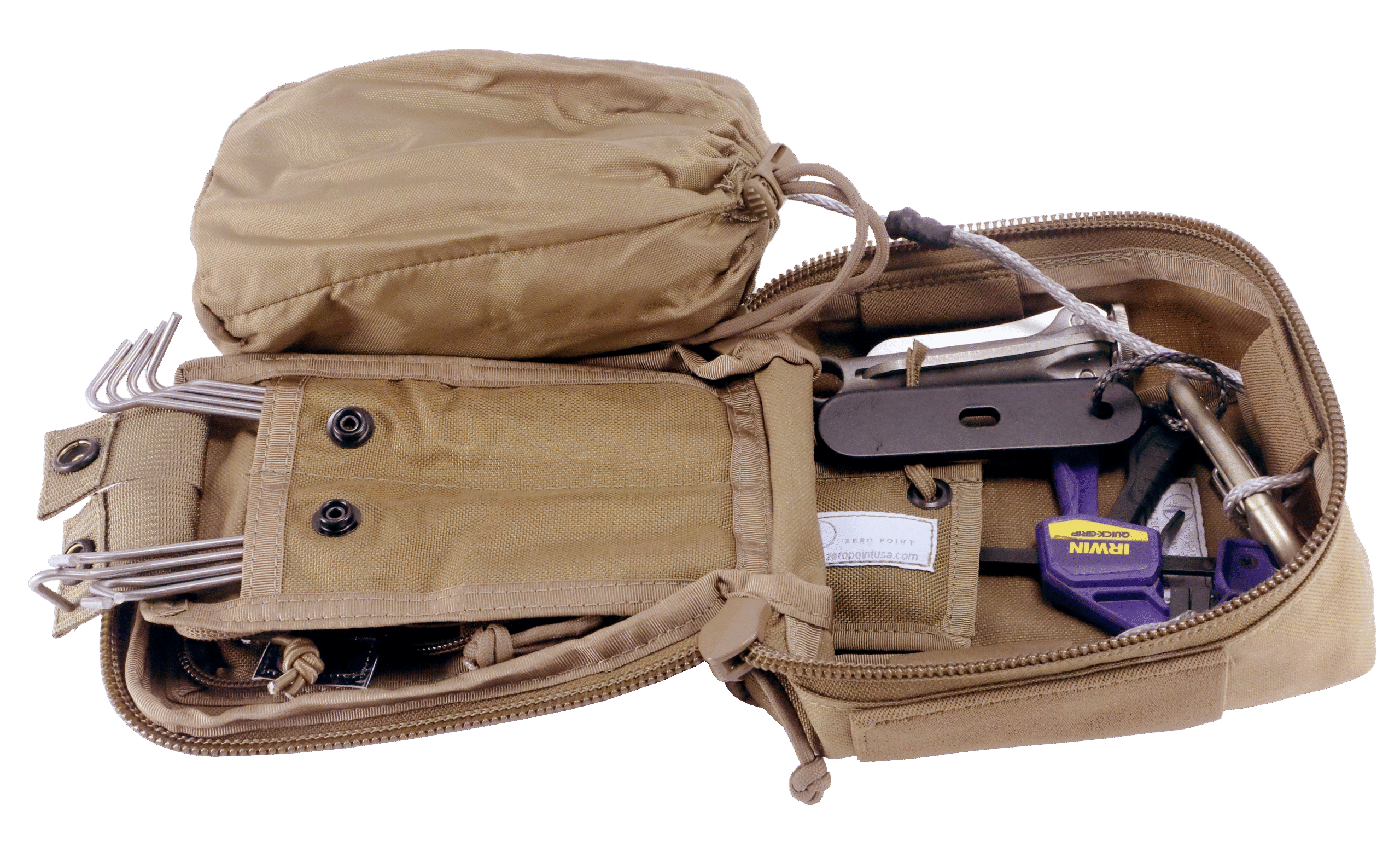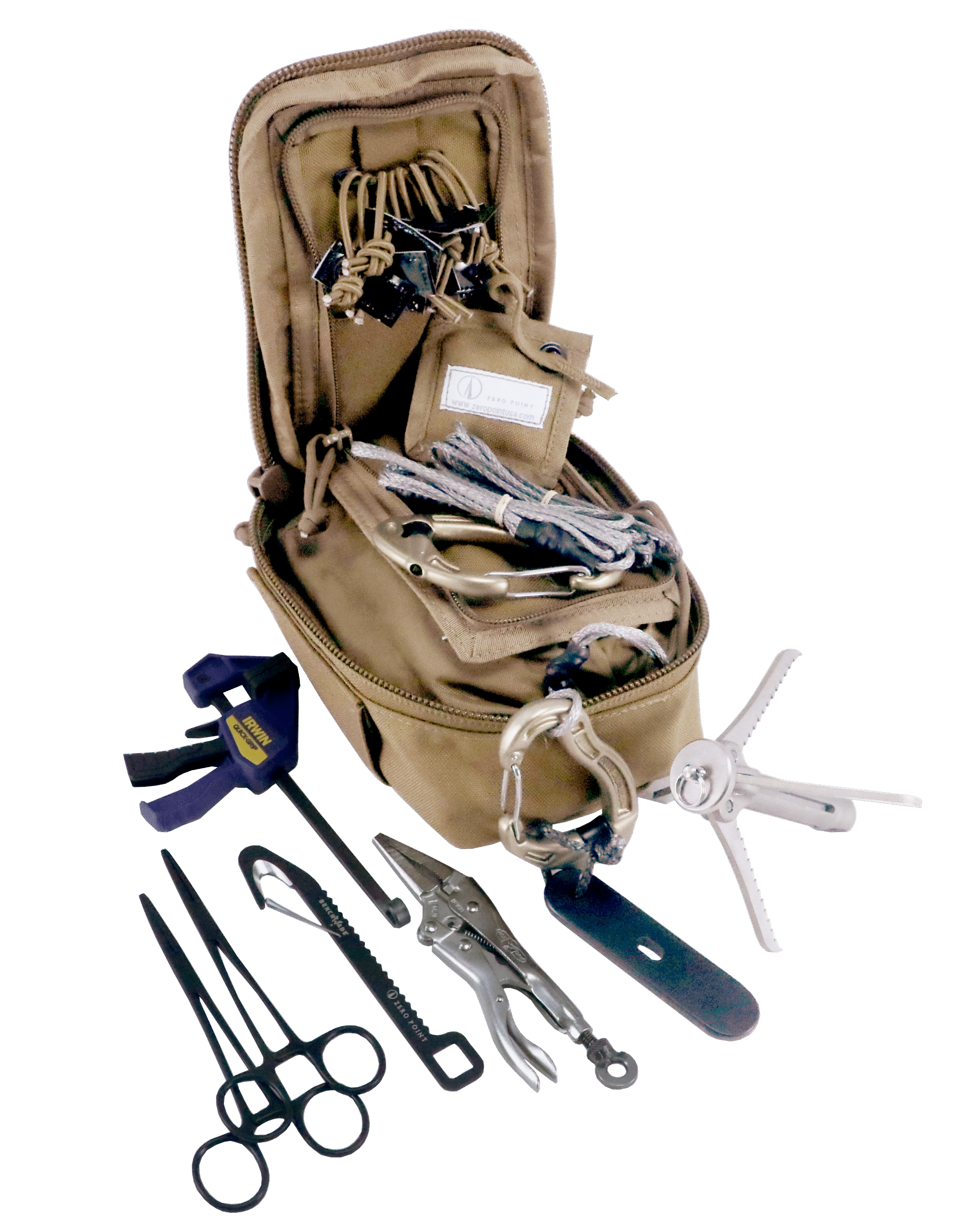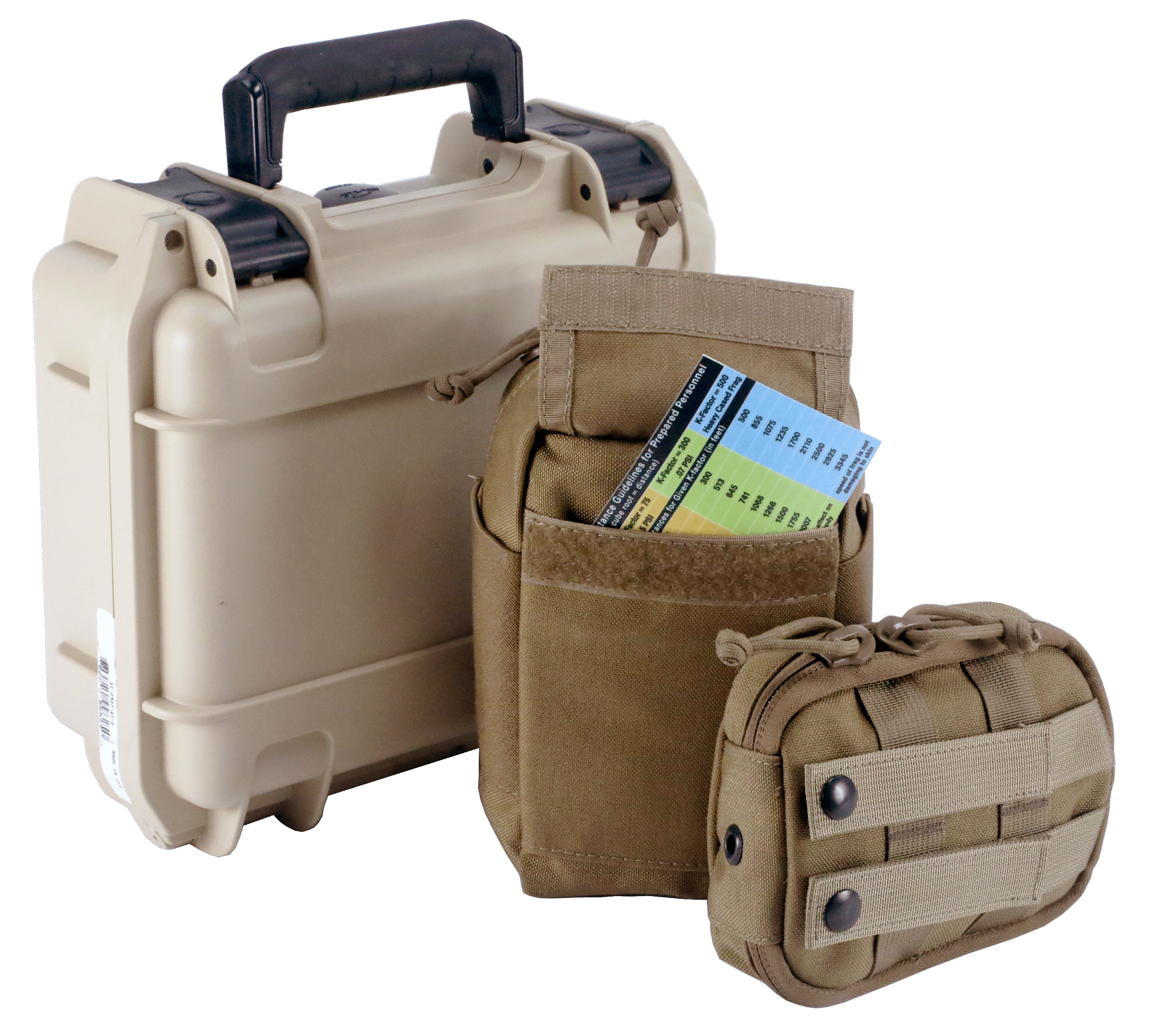 The kit includes 200 feet of Dyneema pull-line and a full complement of clamping, rigging, and cutting tools designed for quick attachment of the pull-line, decreasing time-on-target and limiting exposure to dangerous overpressure and fragmentation hazards. The kit also includes a hazard marking system suitable for day or nighttime use. The kit can be mounted directly to a MOLLE-compatible system. Plus 100 feet of pull-line and a smaller custom pouch for a reduced load out.