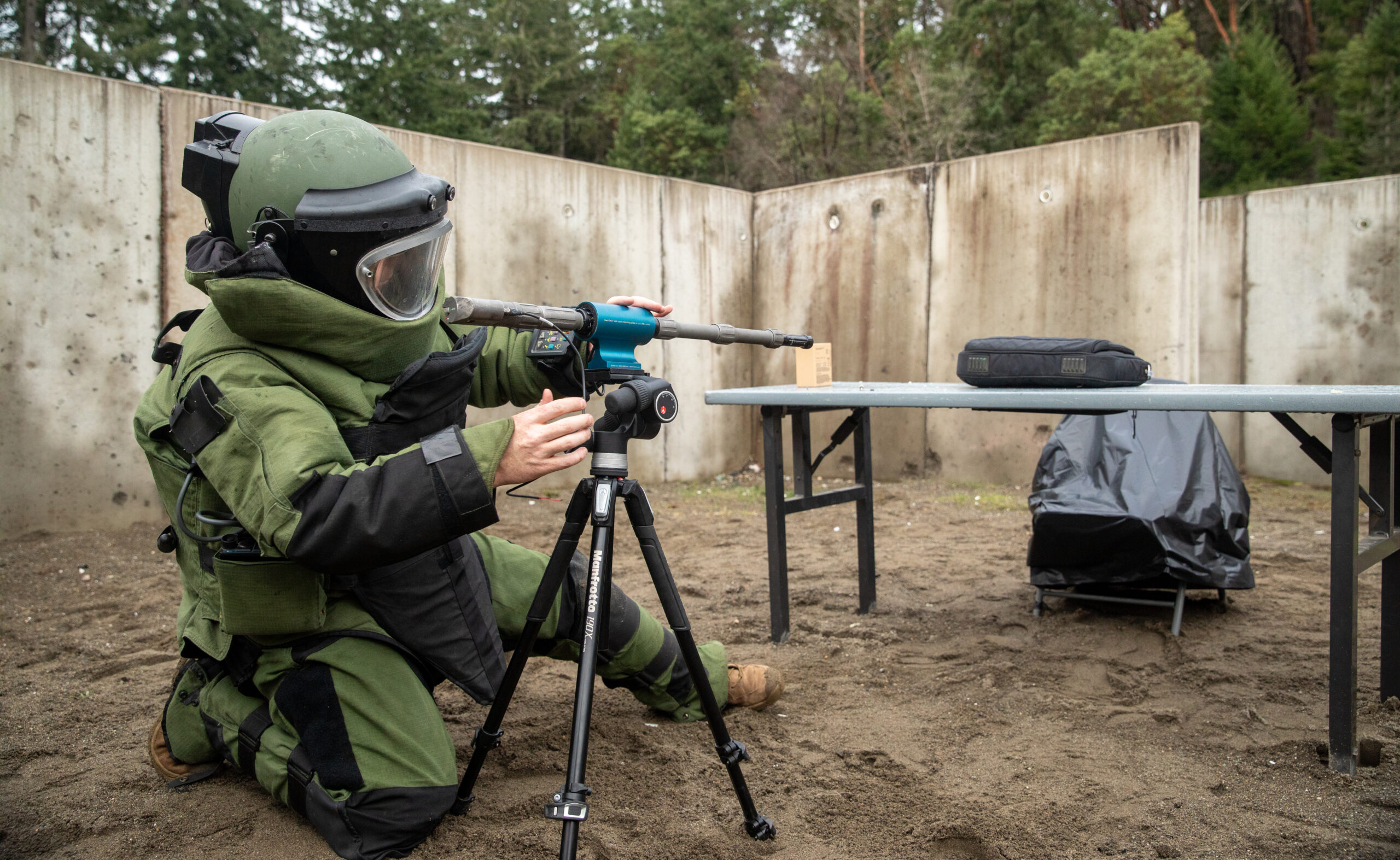 U.S. Army soldier aims his TiTAN Disruption System onto the scenario explosive for Day 4 of the Battalion Team of the Year Competition at Joint Base Lewis-McChord, Washington, 25 JAN 2024.