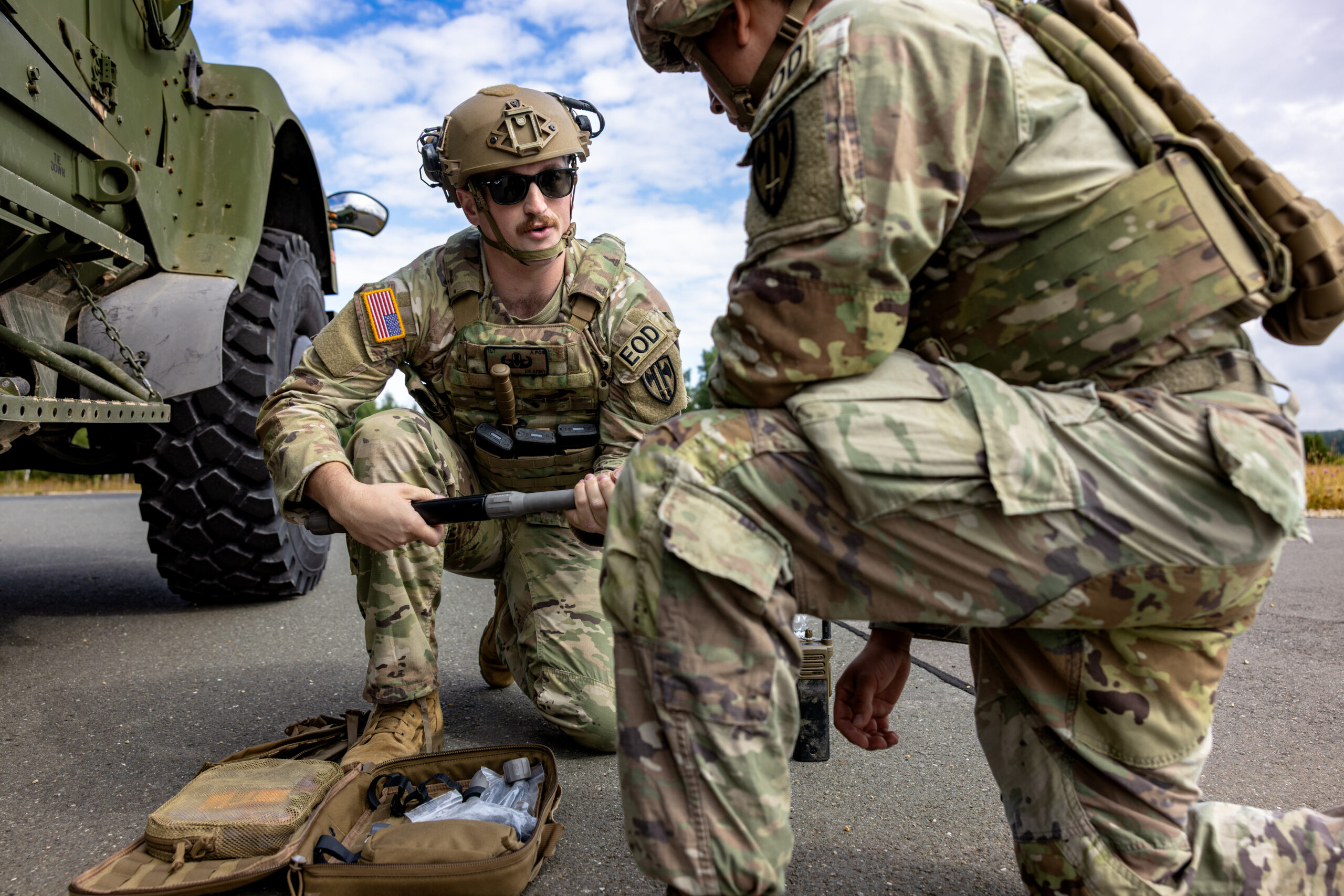 U.S. Army 1st. Lt. William Caudle, an explosive ordnance disposal officer assigned to the 702nd Ordnance Company, 18th Military Police Brigade, assembles a TiTAN Disruption System for unmanned aircraft system training at Balli Airfield, U.S. Army Garrison Bavaria, 08 July 2025.