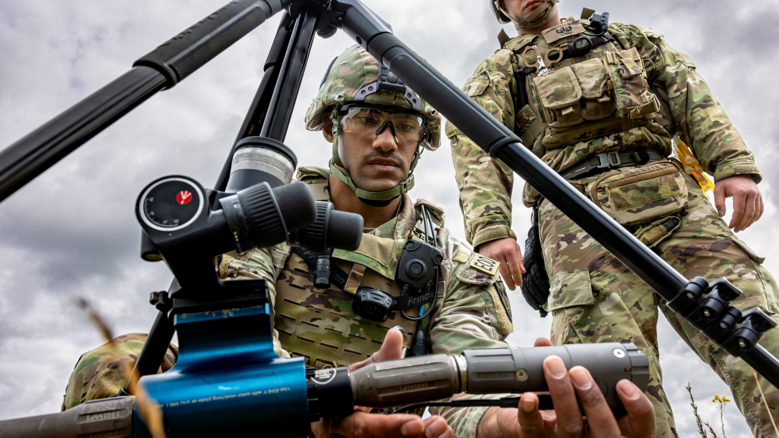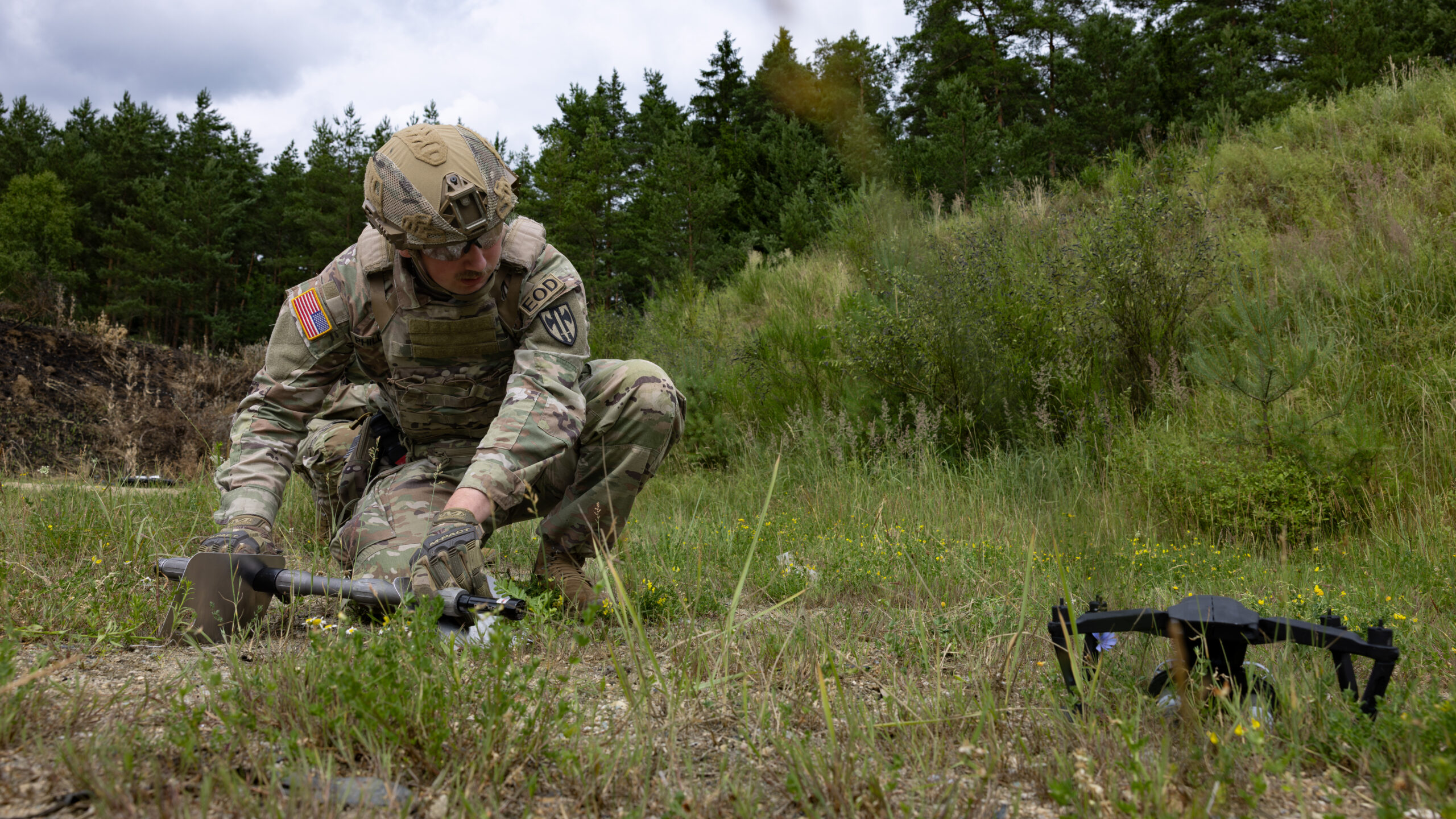 U.S. Army Sgt. Austin Phillipson, an explosive ordnance disposal technician assigned to the 720th Ordnance Company, 18th Military Police Brigade, aligns his shot on an unmanned aircraft system with the TiTAN Disruption System at the Explosive Ordnance Disposal Demolition Range, U.S. Army Garrison Bavaria, 08 JULY 2025.